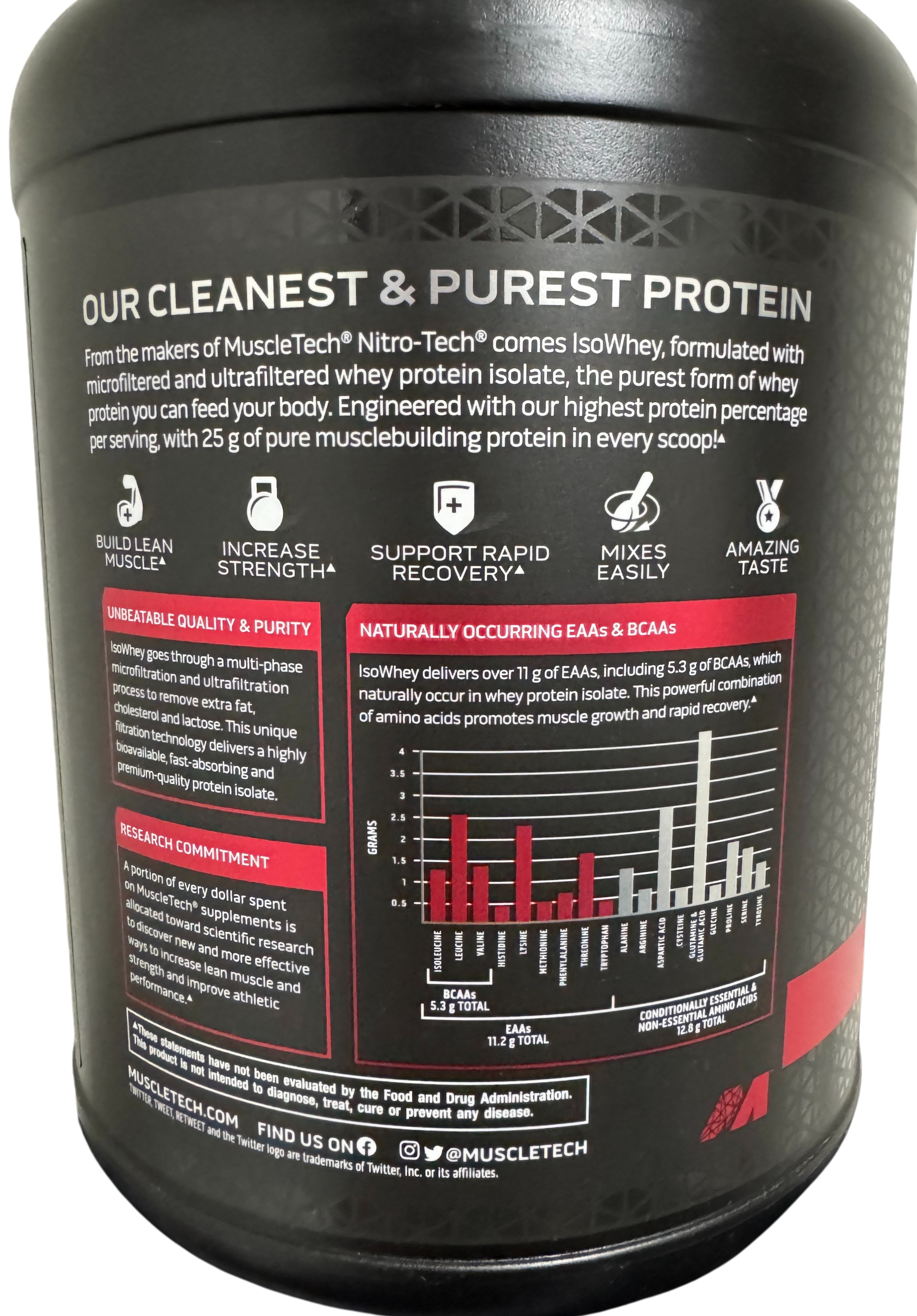 Muscletech ISO Whey es una proteína 100% aislada, diseñada para quienes buscan máxima pureza, rápida absorción y una digestión más ligera. Con 25 g de proteína por porción y 0 g de azúcar añadida, es ideal para apoyar la definición muscular, recuperación y rendimiento sin calorías extras.